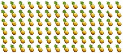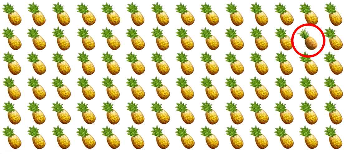 Na obrazku znajduje się wiele ananasów, są one pokazane w kilku rzędach. Twoim zadaniem jest znalezienie specjalnego ananasa, który różni się od pozostałych.