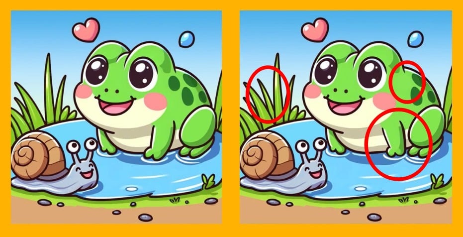 Czy jesteś gotowy na kolejne wyzwanie? Przyjrzyj się uważnie dwóm obrazkom przedstawiającym żabę i ślimaka. Na pierwszy rzut oka mogą wyglądać tak samo, ale są między nimi 3 małe różnice. Myślisz, że jesteś w stanie znaleźć je wszystkie w 17 sekund? Spróbuj i sprawdź swoją ostrość widzenia!