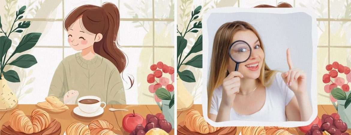 Zdjęcia przedstawiają uroczą dziewczynę jedzącą śniadanie w swojej kuchni. Pije kawę (lub herbatę) z pysznymi rogalikami. A na deser powinna zjeść owoce. Zdjęcia wyglądają prawie identycznie, z czterema subtelnymi różnicami między nimi. Czy będziesz w stanie je znaleźć?