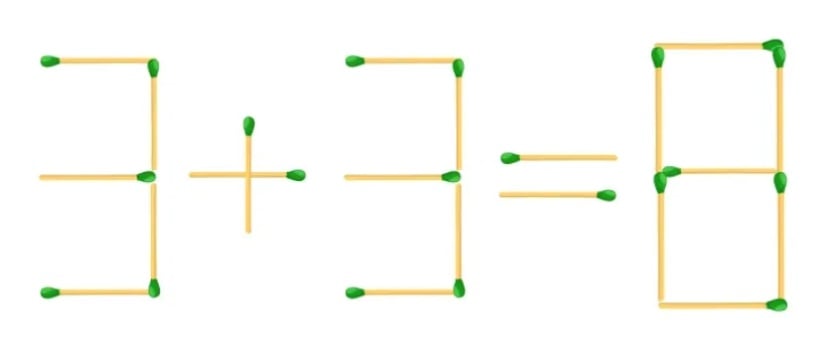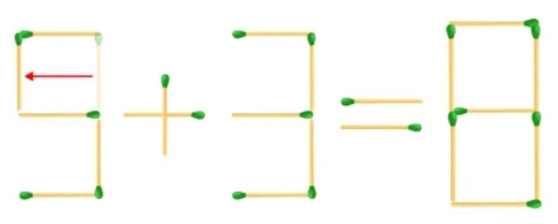 Sekret polega na zmianie kształtu liczb: wystarczy przesunąć jedną zapałkę, aby jedna z „trójek” zamieniła się w „piątkę”. Następnie przykład staje się całkowicie poprawny – 5+3=8.