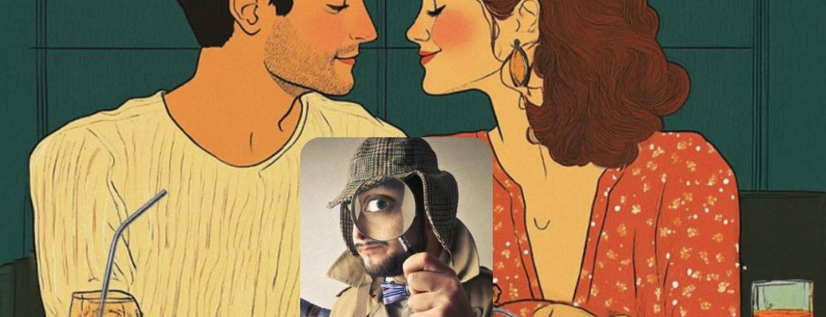 Przed tobą stoją zakochani mężczyzna i kobieta, miło rozmawiający podczas romantycznej kolacji. Dziewczyna ubrana jest w elegancką sukienkę, a mężczyzna w lekki sweter. Na stole widać szklanki z napojami i kilka smacznych potraw. Na ścianach lokalu wiszą obrazy, a z sufitu zwisają żarówki.
