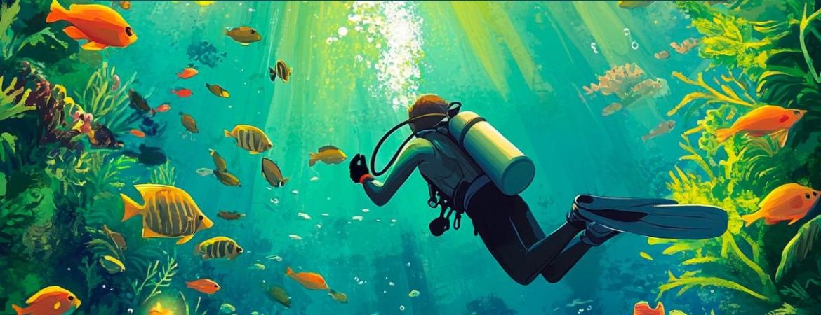 Obrazek przedstawia nurka pośród podwodnego krajobrazu. Twoim zadaniem jest uważne przyjrzenie się obrazkowi i znalezienie w nim rażącego błędu. Jeden z przedstawionych szczegółów jest niemożliwy.
