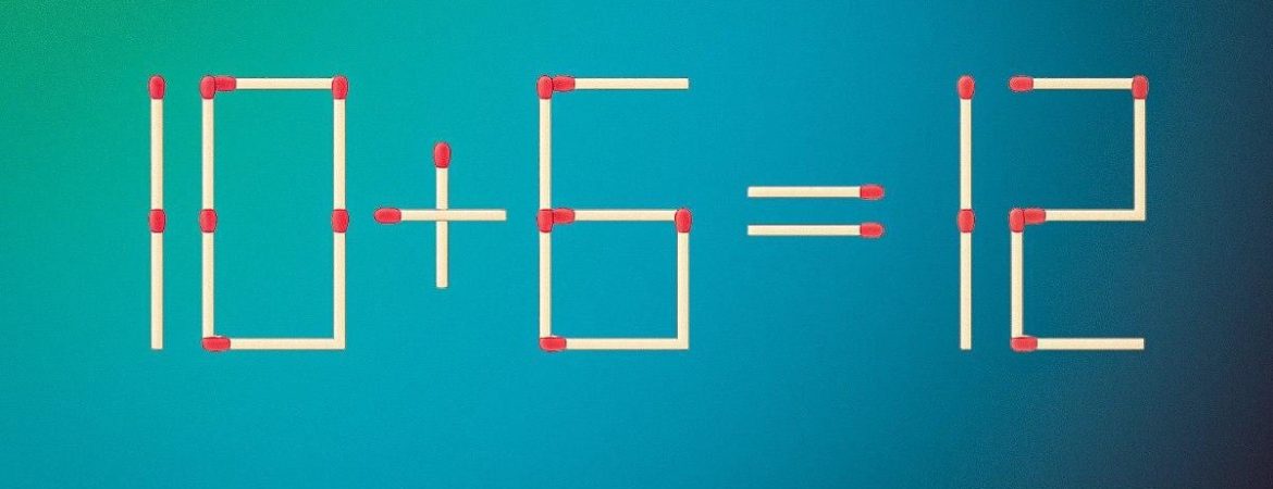 Poniżej znajduje się obrazek, na którym równość 10+6=12 jest ułożona za pomocą zapałek. Oczywiście nie jest to poprawne matematycznie. Musisz ją poprawić.
