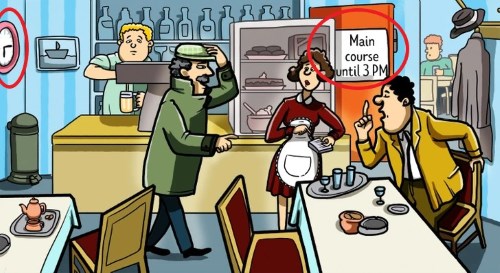 Wskazuje to, że kelnerka próbowała oszukać pijanego mężczyznę. Twierdziła, że z powodu stanu nietrzeźwości nie pamiętał on, że zamówił mięso dwie godziny temu. Ale jeśli na zegarze jest 18:15, to dwie godziny wcześniej była 16:15. A w tym czasie mięso nie mogło zostać zamówione.