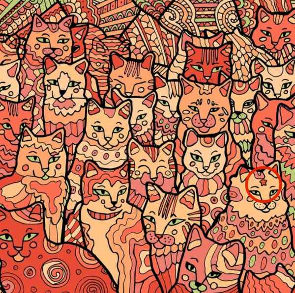 Masz tylko 9 sekund na znalezienie poprawnej odpowiedzi. Gdy zaczniesz przyglądać się obrazowi, zauważysz tło wypełnione kotami, które odgrywają znaczącą rolę w doskonałym ukryciu gwiazdy;