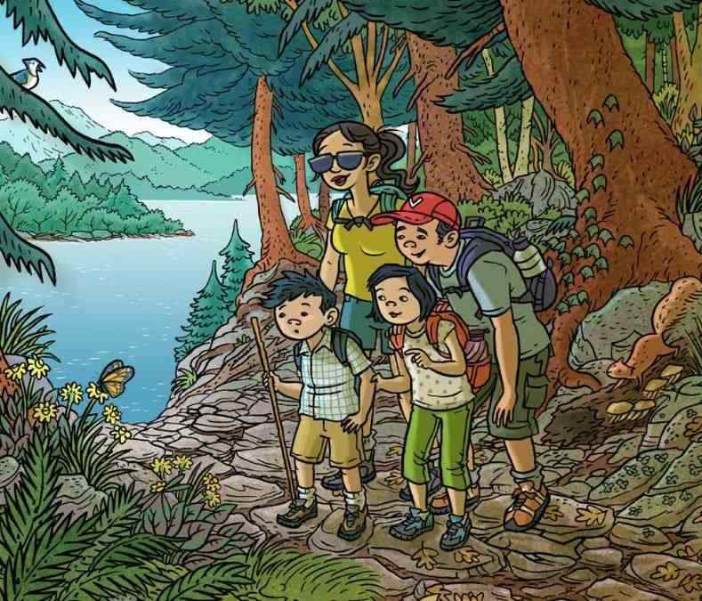 Zdjęcie przedstawia kobietę i jej dzieci na łonie natury. Wygląda na to, że robią zdjęcia. Gdzieś w pobliżu ukrywa się również wąż, którego należy znaleźć.