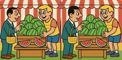 Czy jesteś gotowy na wyzwanie? Przyjrzyj się uważnie dwóm zdjęciom mężczyzny kupującego arbuza. Na początku zdjęcia mogą wyglądać tak samo, ale istnieją 3 małe różnice. Myślisz, że jesteś w stanie znaleźć je wszystkie w 27 sekund? Spróbuj i sprawdź swoją ostrość widzenia!