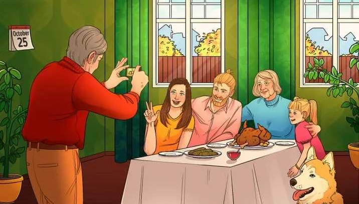Na kolejnym zdjęciu widzimy rodzinę sfotografowaną przy stole z okazji Święta Dziękczynienia. Na fakt, że rodzina obchodzi Święto Dziękczynienia wskazuje tradycyjny indyk na stole.