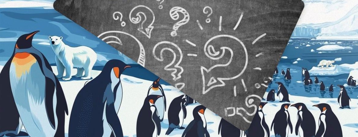 Błąd polega na tym, że pingwiny i niedźwiedzie polarne żyją na różnych biegunach Ziemi. Pingwiny żyją na biegunie południowym na Antarktydzie, a niedźwiedzie polarne na biegunie północnym w Arktyce. I nie powinny się spotykać.