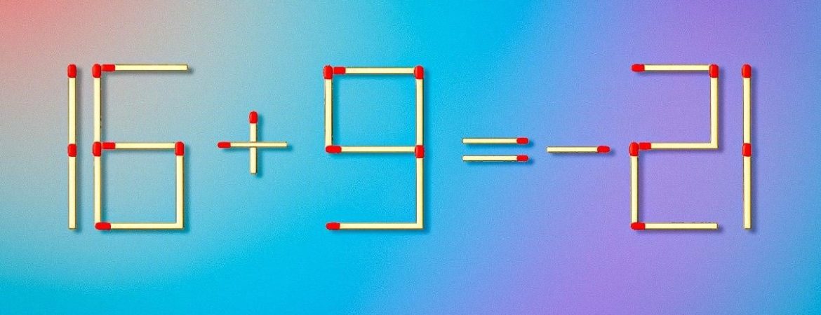 Na obrazku – niepoprawna równość złożona z 26 zapałek: 16 + 9 = -21. Twoim zadaniem jest przeciągnięcie tylko jednej z nich, aby równość była poprawna.